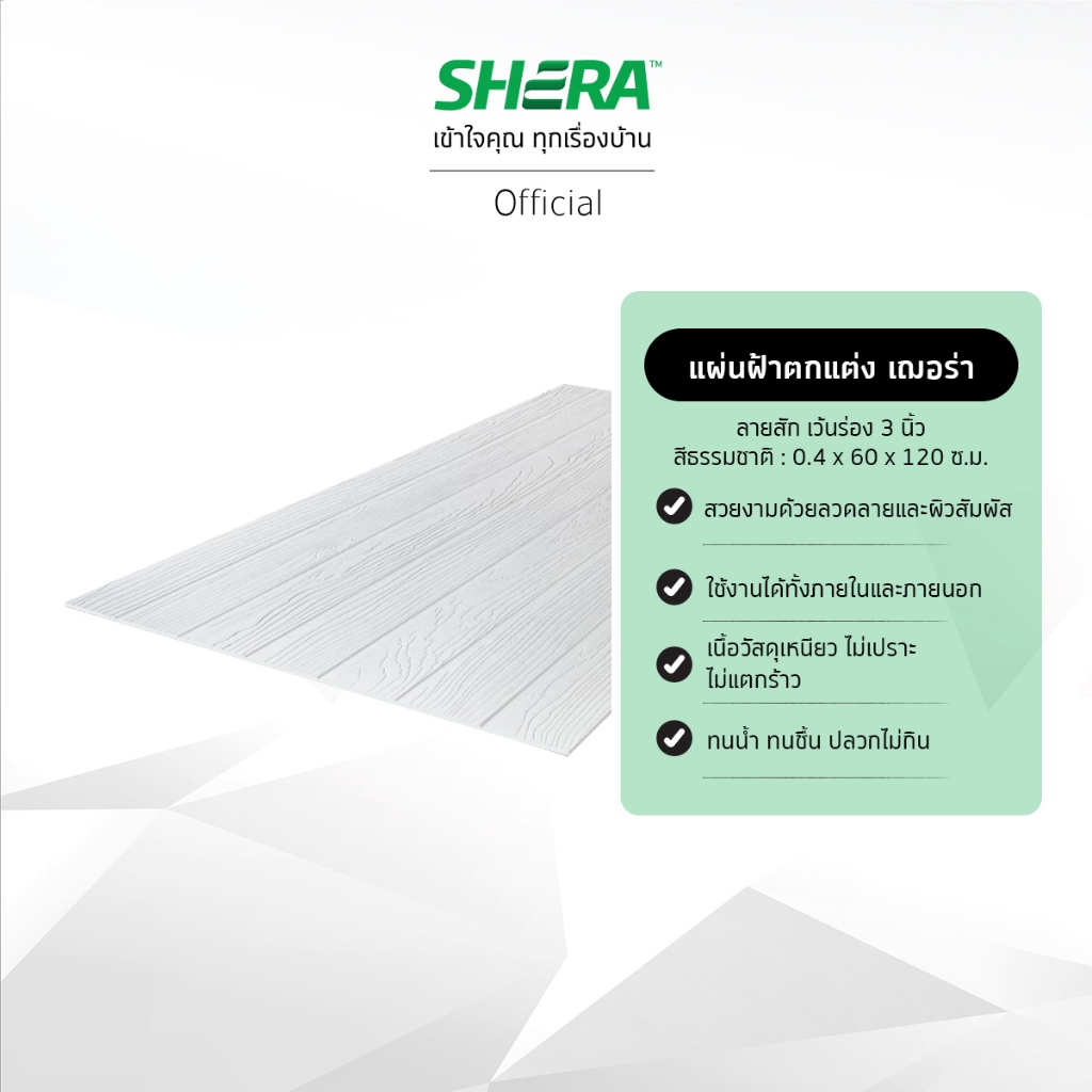 SHERA แผ่นฝ้าตกแต่ง เฌอร่าบอร์ด ลายสักเว้นร่อง 3 สีธรรมชาติ เป็นผลิตภัณฑ์จากแบรนด์เฌอร่า (SHERA) ซึ่งผลิตจากวัสดุไฟเบอร์ซีเมนต์คุณภาพสูง มีจุดเด่นในด้านความทนทานและดีไซน์ที่สวยงามเลียนแบบธรรมชาติ เหมาะสำหรับการใช้งานตกแต่งทั้งภายในและภายนอกอาคาร